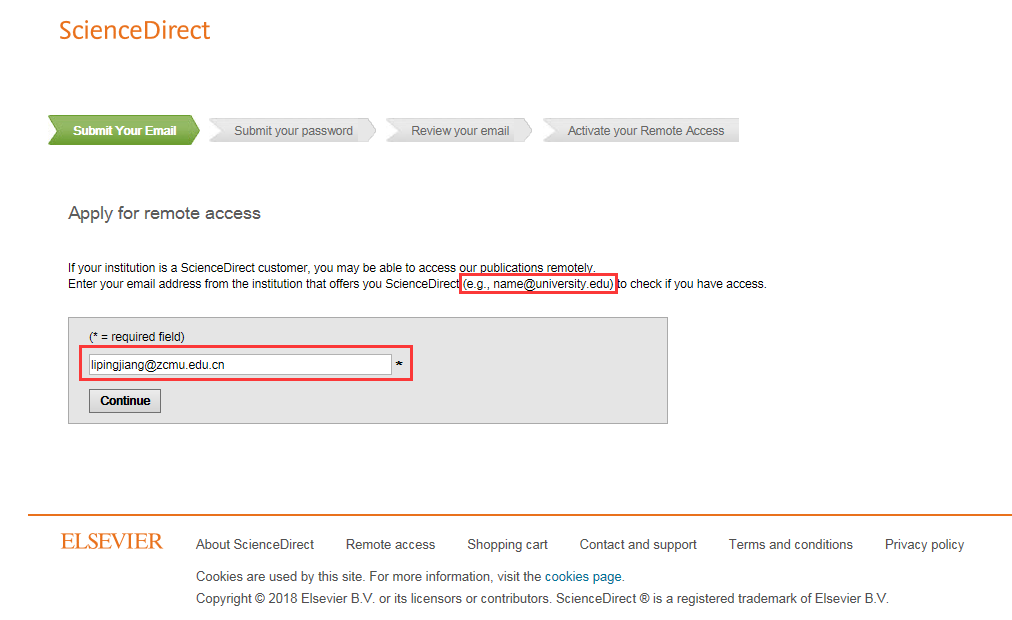 步骤3:进入到Submit Your Email界面输入所属单位邮箱并点击Continue,系统会自动发送confirmation email到输入的邮箱。