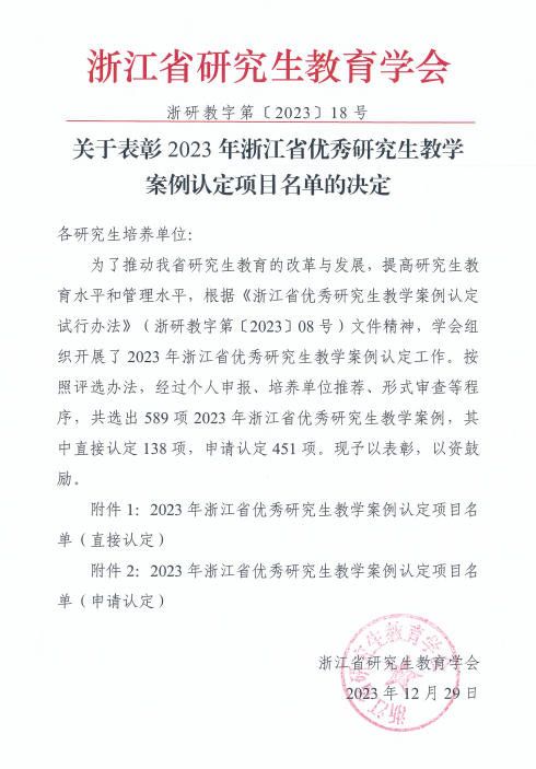 2023年浙江省优秀研究生教学案例中,bb贝博艾弗森官网bb贝博艾弗森官网有9项案例认定为优秀案例,数量上达到新的突破!