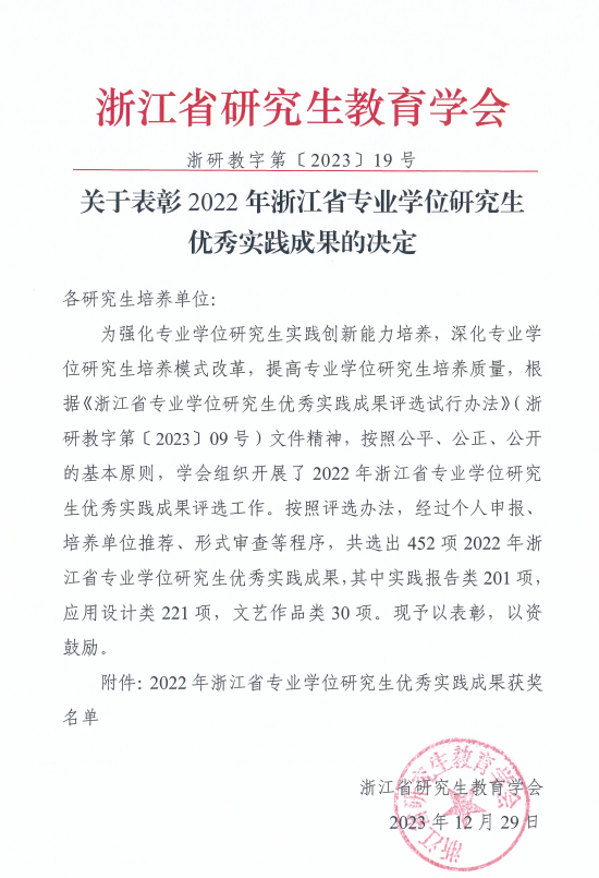 bb贝博艾弗森官网3位专硕研究生相关成果获2022年浙江省专业学位研究生优秀实践成果!