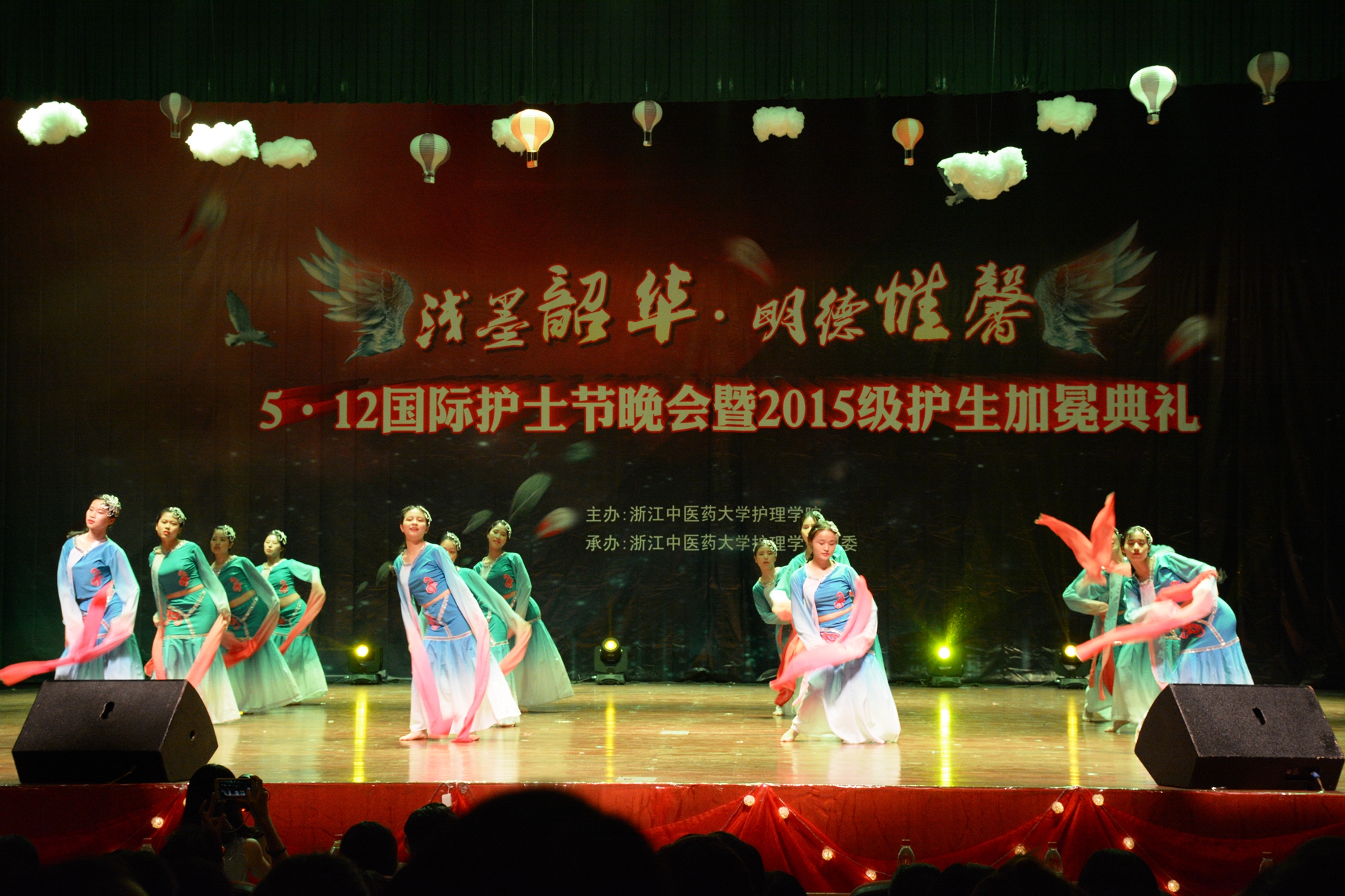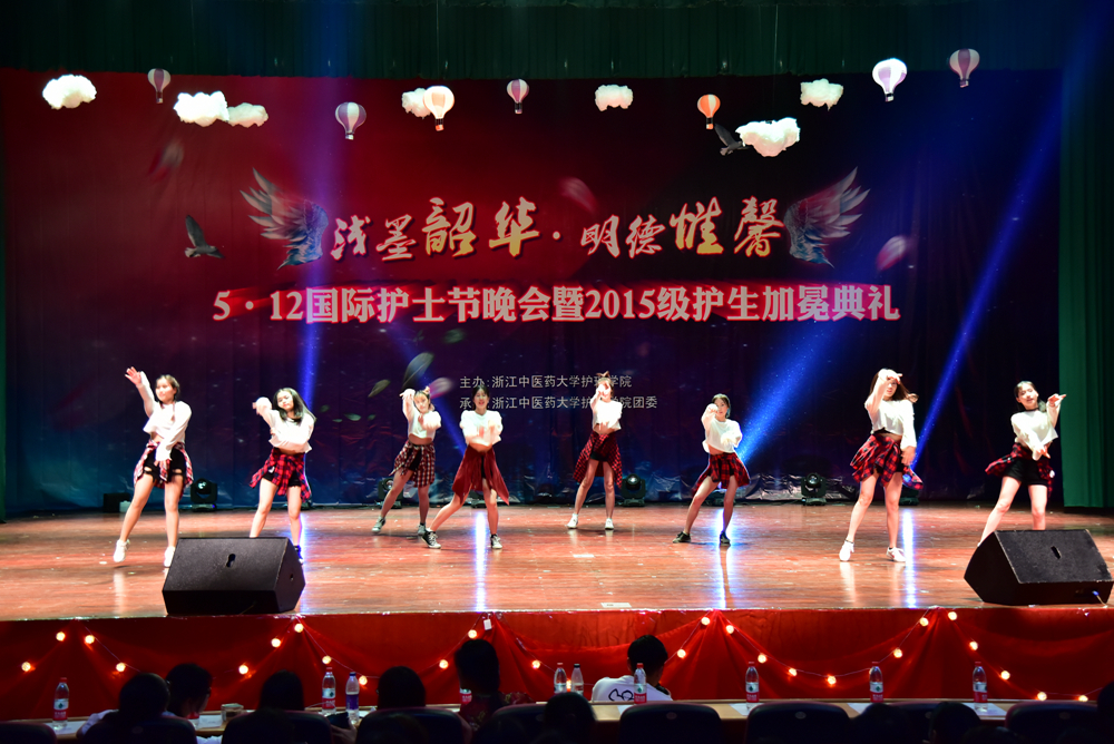 加冕仪式结束后,护士节文艺晚会正式开始。文艺表演精彩纷呈,现场气氛高潮迭起。《履道富春》将一段富春江畔的成长画卷展开在大屏幕上,2015级500余名护生通过视频和舞台剧回忆了过去一年在富春江畔作为护生的奋斗和成长,同时袭素素白衣通过歌舞剧《护士之歌》对未来职业进行了展望。晚会更让青春风采飘扬,歌曲浙中大版《成都》、《凉凉》、古典舞《采薇》,有动有静,亦柔亦刚,颇有“杨柳意缠绵,飞雪亦烈烈”之感。人文魅力在歌声中悠然点亮,青春之花在舞步中翩然绽放,在耀耀烛辉中将德音共话。红旗团支部的展演和最美天使的颁奖,学长学姐经历拼搏后的风采风貌在一个个眼眸中流光溢彩,这绰绰风华翩跹才情令人憧憬。最终,活动在吉他社鹿鸣乐队的春风十里和惊喜“seve”集体舞中圆满落下了帷幕。