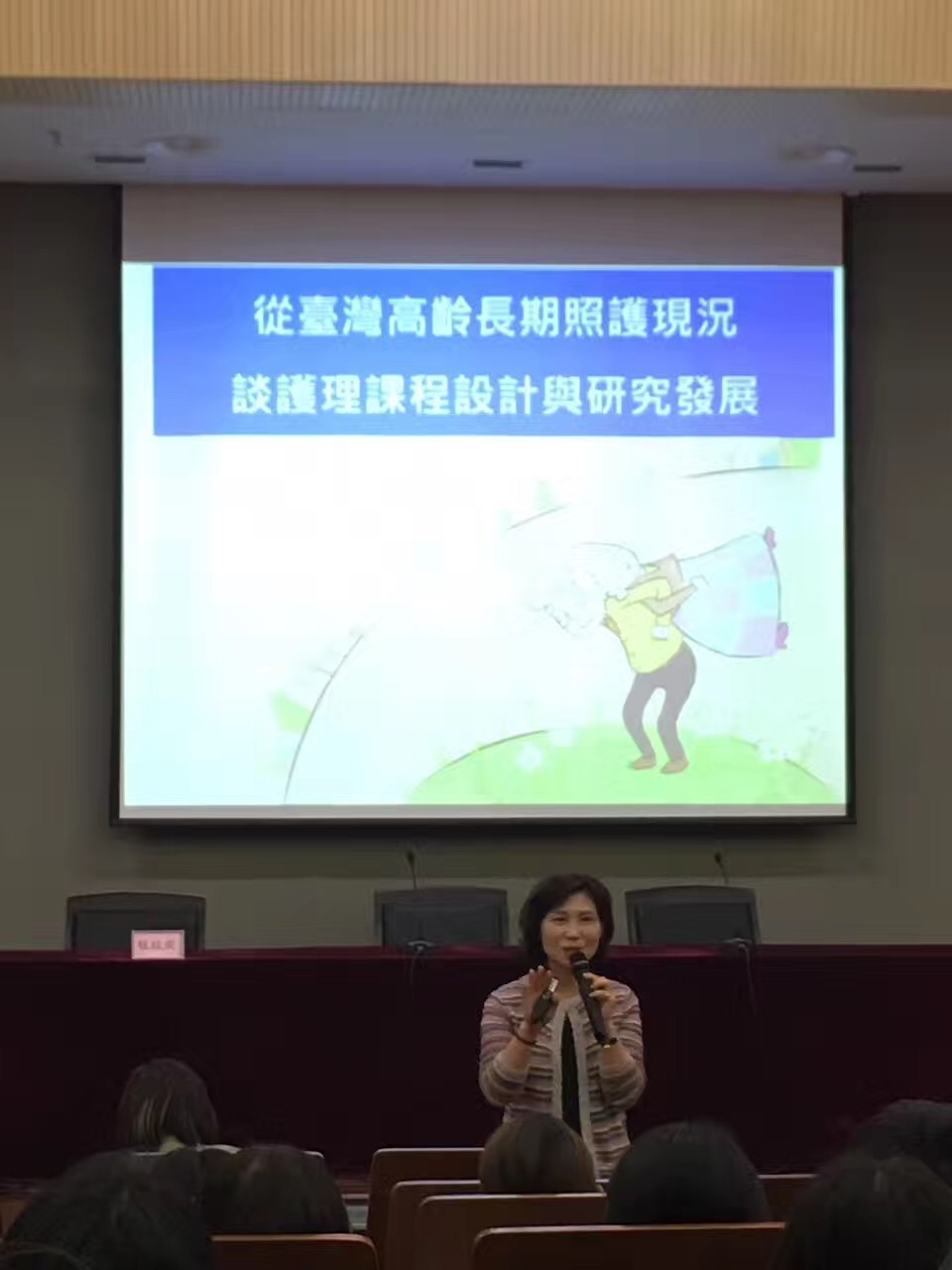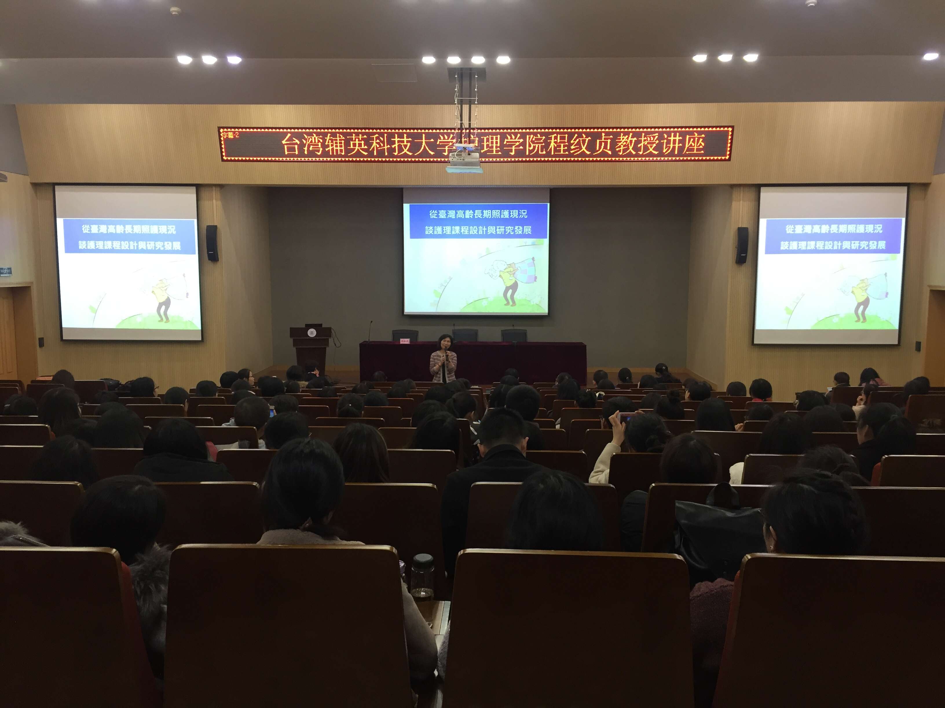 程院长从长者(老年人)的定义出发,称长者为“乐龄(learning)——快乐学习、乐而忘龄”出发,引出本次讲座的主题《从台湾高龄照护现状谈论护理课程设计与研究发展》。她具体阐述了“积极老龄化”乐龄护理理念及“因地制宜”的规划模式,分析了台湾地区长者(老年人)长期照护的发展特色——“在地化”、“多元化”、“小区化”和“网络化”,梳理了台湾护理“在地养老”的实践经验和主要成效。