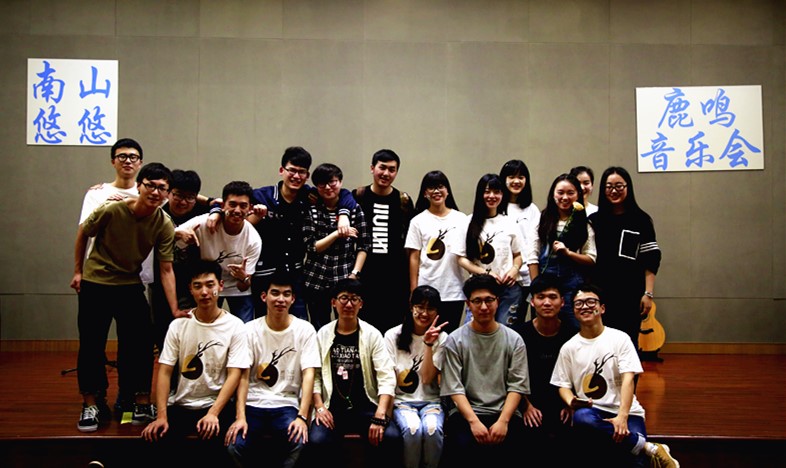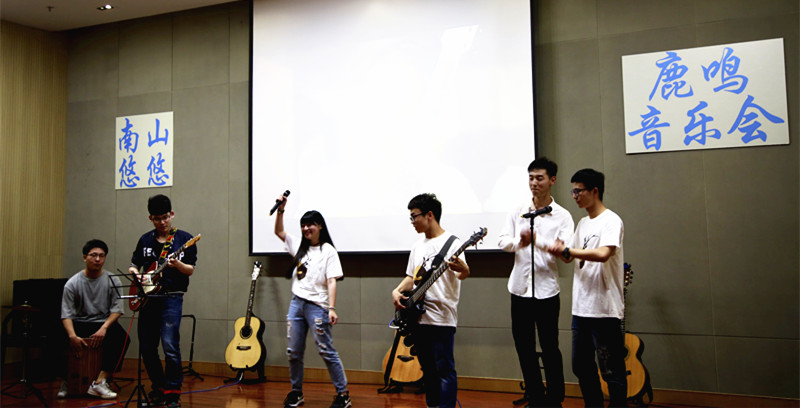 鹿鸣乐队由主唱姜飞宇、何颖,吉他手刘钊慧,鼓手王小娟等七人组成,每个人都各具特色。他们以大家耳熟能详的《风吹麦浪》作为开场秀,七个俊男靓女拿着吉他、打着鼓,站在那儿就能感受到那袭面而来的清纯与活力。紧接着的《喵小姐》、《给我一个吻》、《uptown funk》、《贝加尔湖畔》等曲目将现场的气氛带向一个又一个高潮。乐队指导老师熊起洪老师(百度原创音乐人,豆瓣原创音乐人,杭州知名吉他教师,杭州指弹吉他演奏家,杭州原创音乐人)也带领他的上禾音乐乐队一展歌喉,一曲《南山南》仿佛是在诉说一个故事,一段与中医药的不解情缘,全场观众热情高涨,全身心投入享受音乐。最后,在袅袅乐音中鹿鸣音乐会落下帷幕。