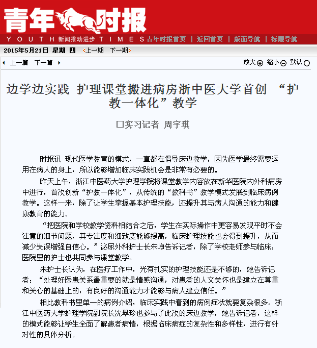 5月20号上午,bb贝博艾弗森官网教务处副处长黄在委、bb贝博艾弗森官网副院长沈翠珍、校党委宣传部新闻宣传科副科长赵颖、bb贝博艾弗森官网院办负责人姚瑶、bb贝博艾弗森官网2012级辅导员杜磊等走进bb贝博艾弗森官网附属第二医院,开展床边教学检查工作,《青年时报》对此次活动进行了报道。