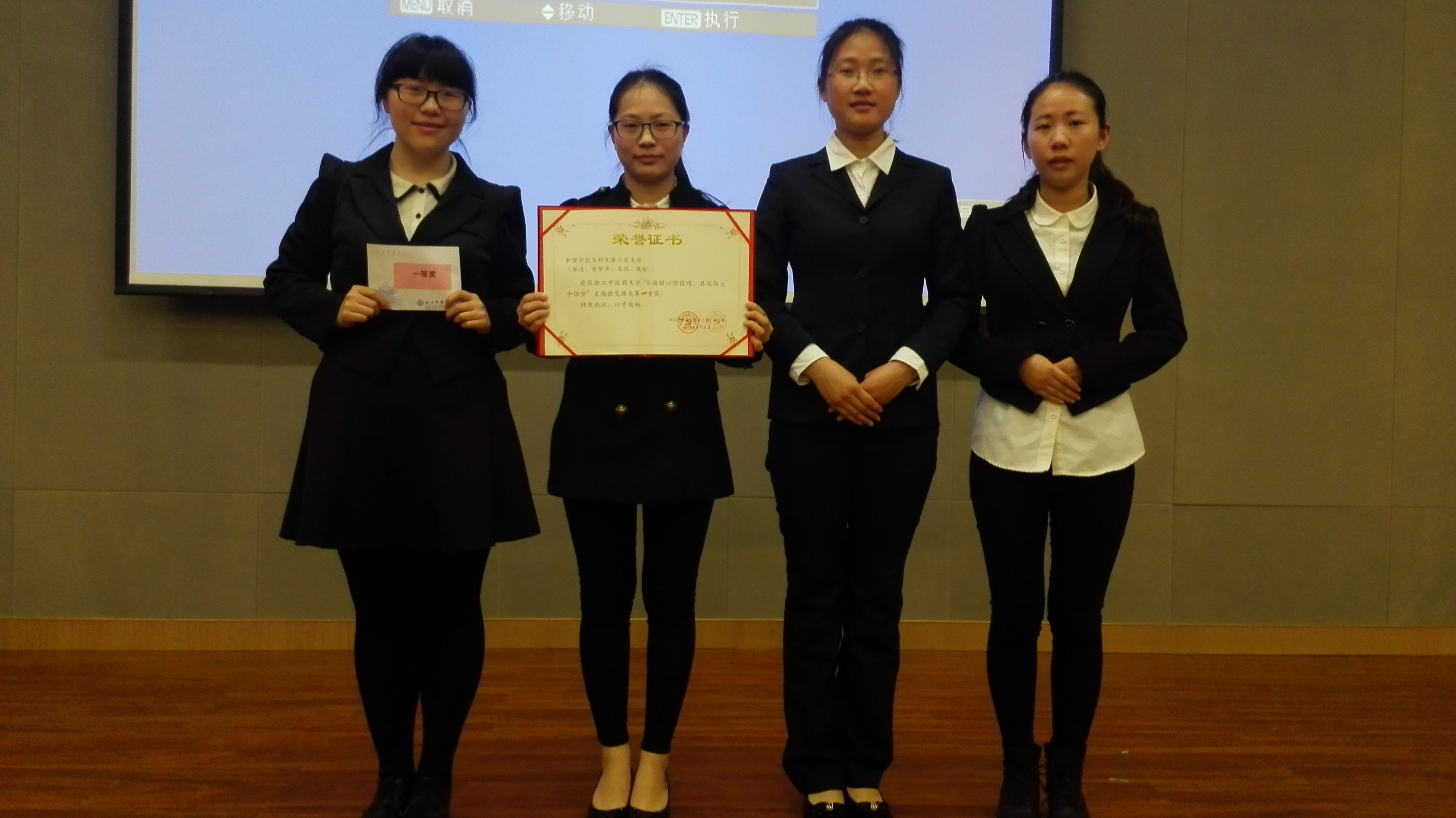比赛中,本科生第三党支部代表队突破传统观念,创新党课形式,以小水滴旅行记的形式,通过描述小水滴在“初始站”、“绿水站”、“青山站”、“终点站”等四个站点的所见所思,将人类生存现状以及浙江党员干部、高校党组织治山治水治环境的先进案例表现的淋漓尽致,从而倡导。无论是新颖而富有逻辑的党课内容、主讲人吴悦同志细腻而精彩的演讲,还是机智冷静的答辩都获得了评委老师的认可与在场观众的阵阵掌声,最终以高分荣获本次比赛一等奖。