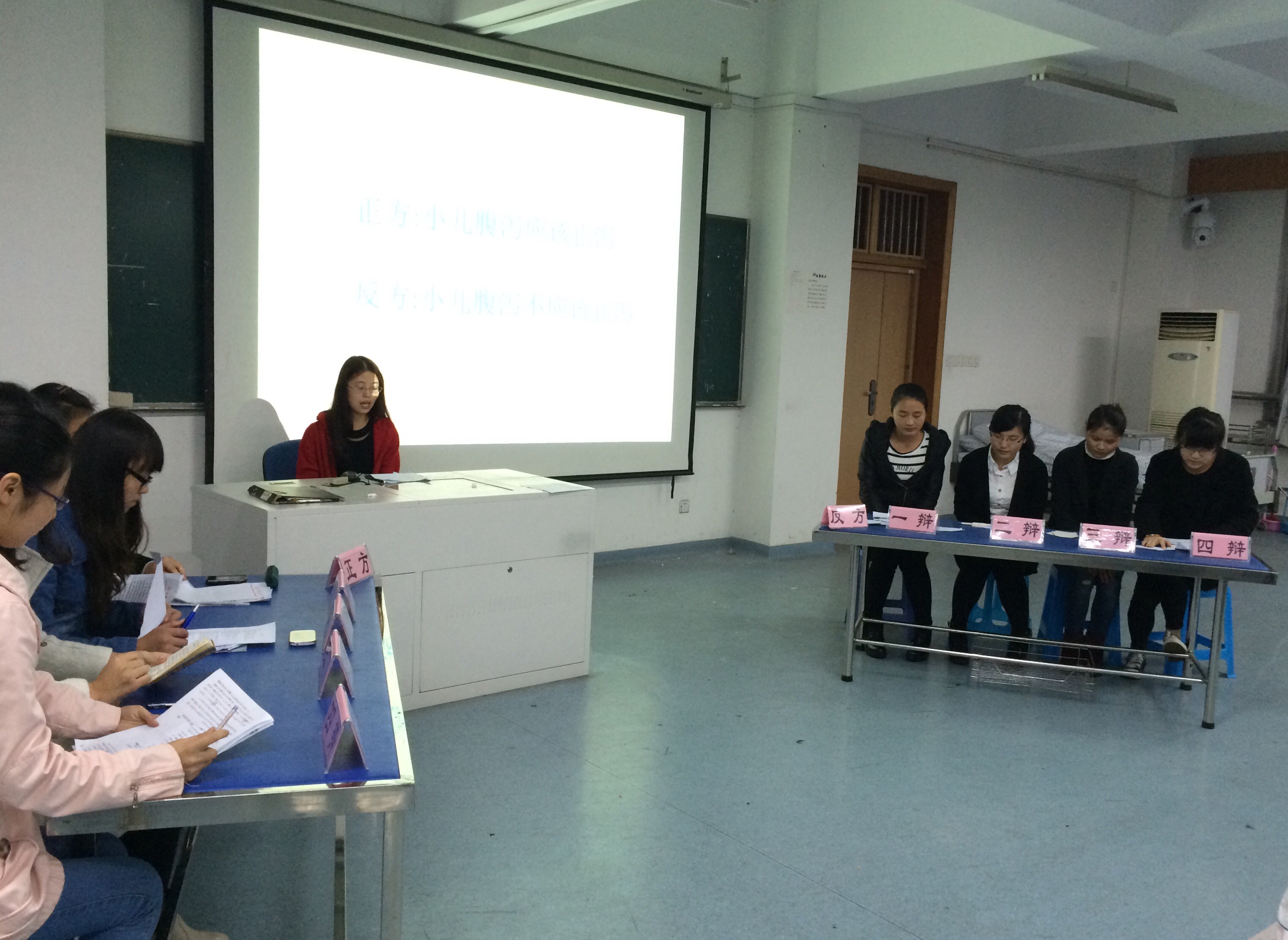 为巩固bb贝博学生的中医基础知识,培养学生的人文素质和思辨能力,营造良好的中医学习氛围,bb贝博中医教研组于2014年11月24日晚上5点30分,在21420教室组织开展了一场紧张激烈的“中医魂”课堂小辩论,正方代表为2012级护理公办1班同学,反方代表为2012级护理公办2班同学,正反双方围绕“小儿腹泻是否应该止泻”进行精彩辩论。到场的嘉宾有bb贝博艾弗森官网老师楼数慧,以及第一临床医学院和bb贝博艾弗森官网的四位研究生,五位也同时担任了本次辩论赛的评委。