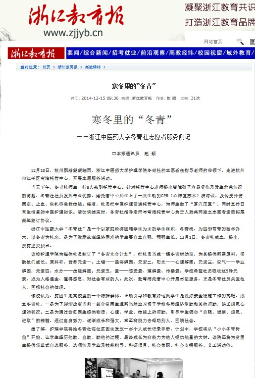 12月10号下午,bb贝博艾弗森官网bb贝博艾弗森官网经济困难学生组织“冬青社”的志愿者在指导老师的带领下,走进杭州市江干区弯湾托管中心,开展志愿服务活动,《浙江教育报》对此次活动进行了报道。