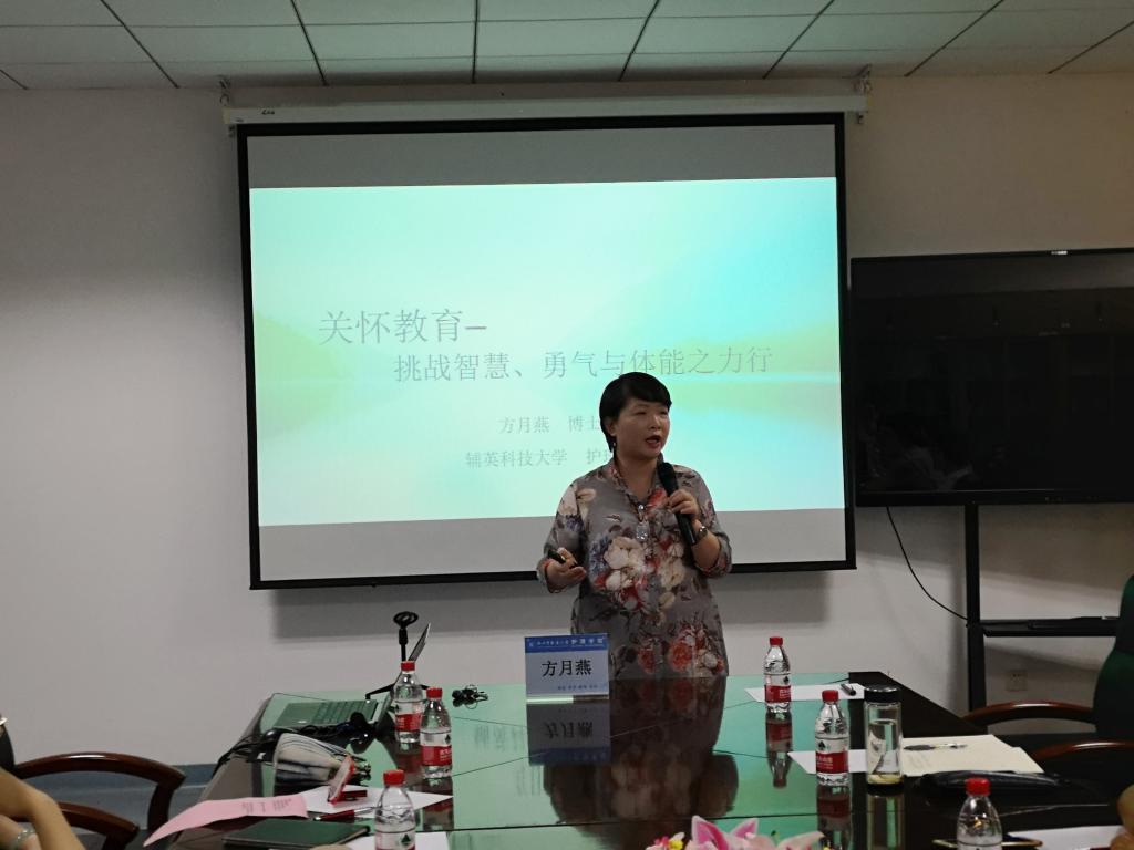 方月燕博士以诙谐幽默的语言介绍了关怀照护的概念、辅英科技大学护理系关怀照护课程形成的历程、关怀照护模式及教学策略等;以生动形象的故事和现场互动,引导师生体验关怀的力量。印象最深刻的一句话是“口头上的支持很虚假,人需要有方法地被支持和赞美。接触和拥抱的力量是不可小觑的,关怀是一种价值观,也是一种文化。”常怀“关怀之心”也是个人价值的体现!方博士的精彩讲座赢得了师生的阵阵掌声,对我们开展体验式教学起到了良好的示范和借鉴作用。
