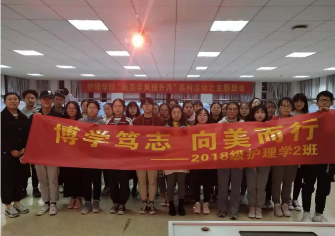 守初心,坚定不移正学风。学院从各本科生党支部中选拔优秀实习生党员,以“不忘初心、牢记使命”主题教育为契机,开展主题班会教育工作。实习生党员从职业发展和实习体会的角度分享对学风要求的理解,积极解决在校护生们学业规划、实习经验、职业发展等方面的疑惑。学院积极开展“最美班集体”评选活动,紧密集合习近平总书记提出的“加强学习,避免‘迷、盲、乱’”的箴言,促进“最美学风”的提升。