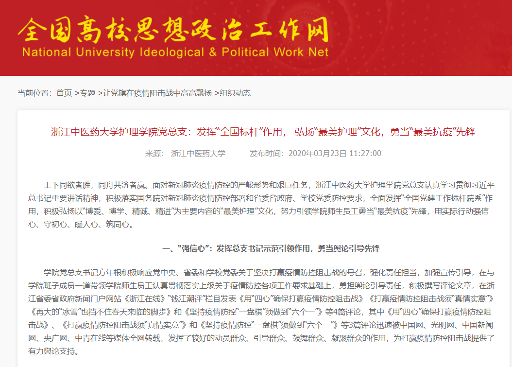 3月23日,全国高校思想政治工作网宣传报道了bb贝博党总支《发挥“全国标杆”作用,弘扬“最美护理”文化,勇当“最美抗疫”先锋》的抗疫工作举措,即“强信心:发挥总支书记示范引领作用,勇当舆论引导先锋;守初心:发挥党支部的宣传教育作用,勇当思想引领先锋;暖人心:发挥师生党员先锋模范作用,勇当志愿服务先锋;筑同心:发挥网络平台资源共享作用,勇当理论学习先锋”。