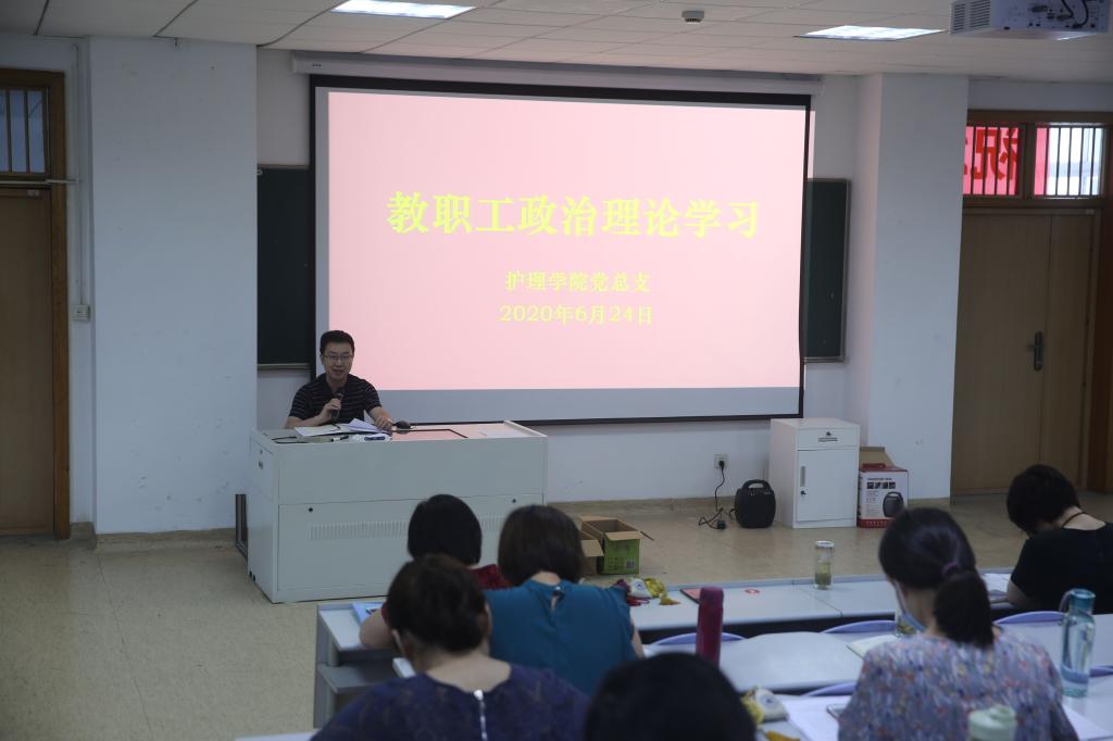 6月24日下午,护理党总支在21518教室举行教职工政治理论学习,专题传达学习省委十四届七次全会精神。会议由学院党总支书记方年根主持,学院全体教职员工参加。