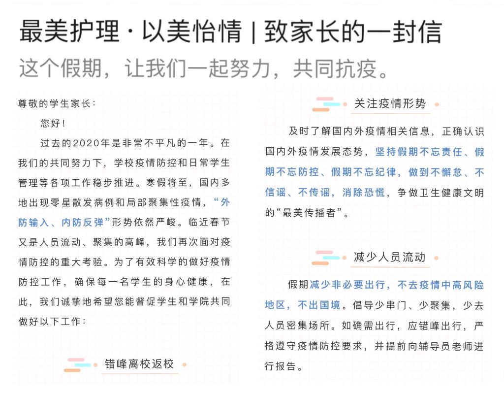 全程管理,落实防控措施。疫情出现反扑后,辅导员迅速摸排全体本科生、研究生的信息,准确梳理各类数据,制定“一人一档”离校学生信息表,确保离校学生底数清,返家行程可追踪。全体辅导员始终保持高度的责任心和使命感,确保相关要求通知到每一名同学。为提升学生居家学习效率,bb贝博艾弗森官网在《致家长一封信》中邀请家长一起引导学生居家学习,健康生活。