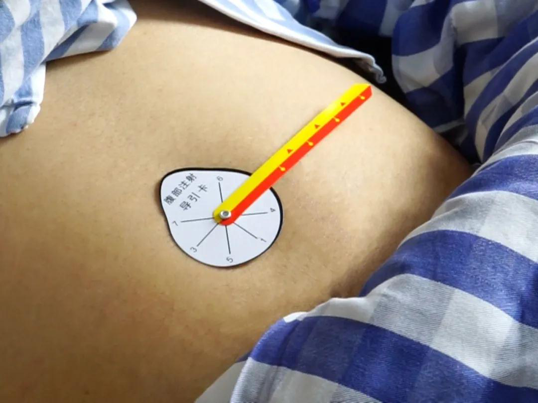 护理部李政老师团队发明的“腹部胰岛素注射导引卡",通过在圆盘上设置一周七天的注射日期,定位尺上设置间隔>2cm的16个注射标识,即使每天注射4次,一个月内也不会重复同一注射点。操作者注射时只需将定位尺调整到当前日期,即可根据标识依次注射,有效轮换。