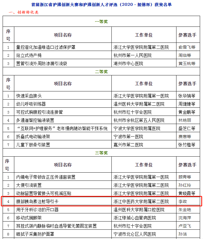 近日,首届浙江省护理创新大赛圆满落幕。此次比赛受到了广大医疗机构和护理人员的积极响应,经过初赛、复赛、决赛“平台展示+专家评审”、线上视频答辩等形式的层层筛选,由附属二院护理部选送的项目“腹部胰岛素注射导引卡",从全省489项参赛项目中脱颖而出,获得三等奖的佳绩。