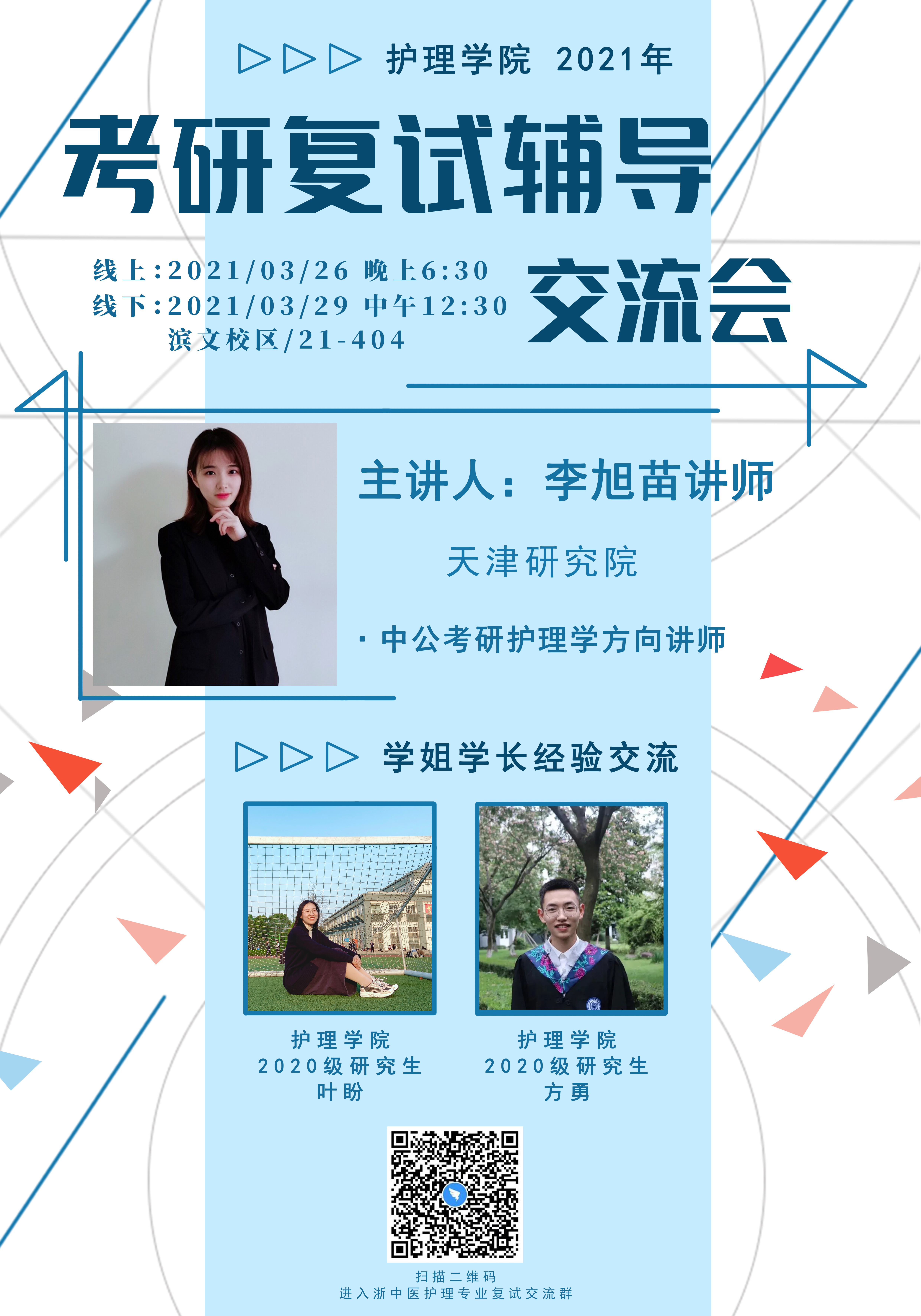 3月26日晚上18:30,学院邀请中公教育护理学方向讲师李旭苗,通过钉钉群在线互动与学生分享交流。李旭苗结合护理学专业特点,强调复试过程中应该注意的问题,并通过线上模拟面试,帮助学生找出面试过程中的问题,让考研复试准备更具有针对性。