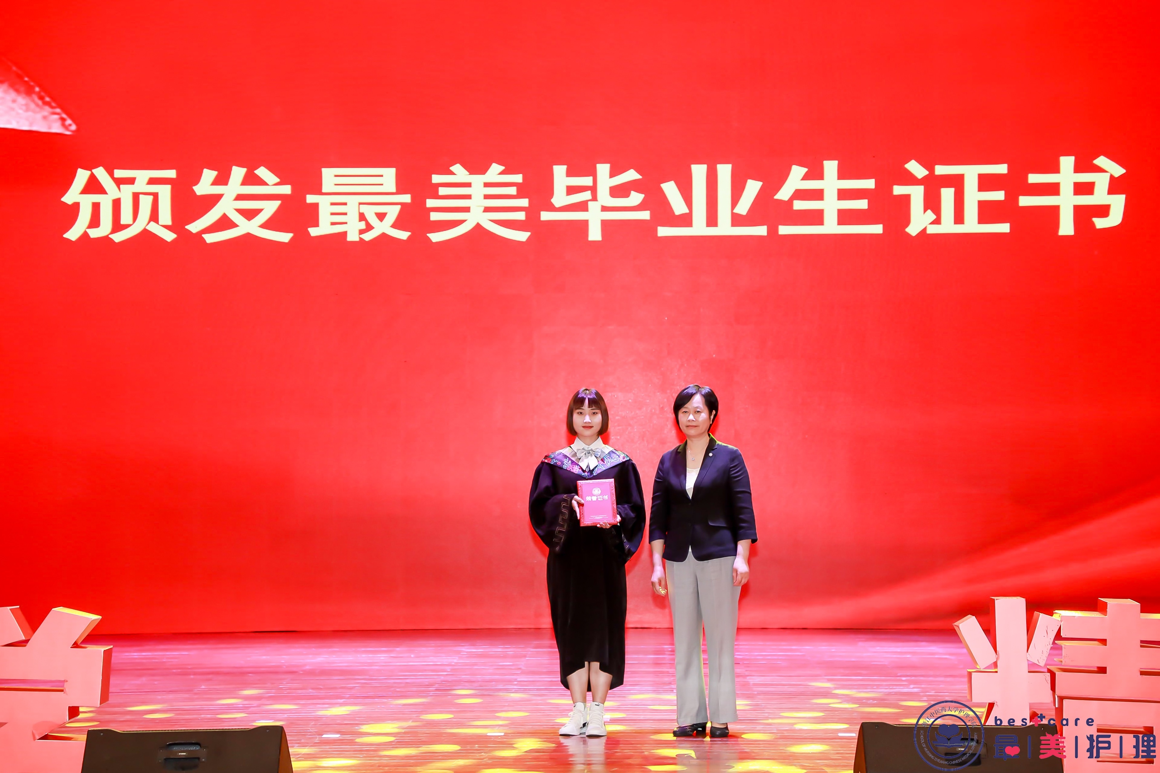 教师代表沈勤老师在发言中饱含深情地表达了对毕业生的叮嘱与期望,鼓励莘莘学子坚守梦想,持续学习,终生学习;坚定信念,勇于担当,当好呵护人类健康的守护神,写下自己的无悔人生。2021届研究生代表谢传艺同学、本科生代表朱倩寅同学与大家分享了在校期间的成长历程,表达了对母校的感激之情,表示要担负起时代重任,做最美护理人,成就新时代护理骄傲。紧接着颁发了校友联络员、校级优秀毕业生、省级优秀毕业生荣誉证书。最后,罗校长为获第十届中国大学生医学技术技能大赛护理学赛道银奖的学生和指导老师颁奖;孙书记为在见义勇为的武天一同学颁发“最美毕业生”证书。在表彰先进的同时,鼓励广大毕业生在未来工作中学习先进、争当先进。