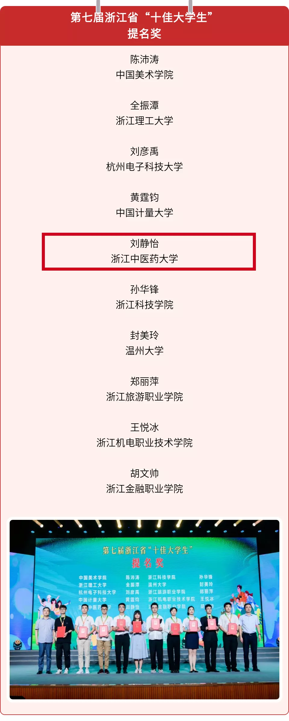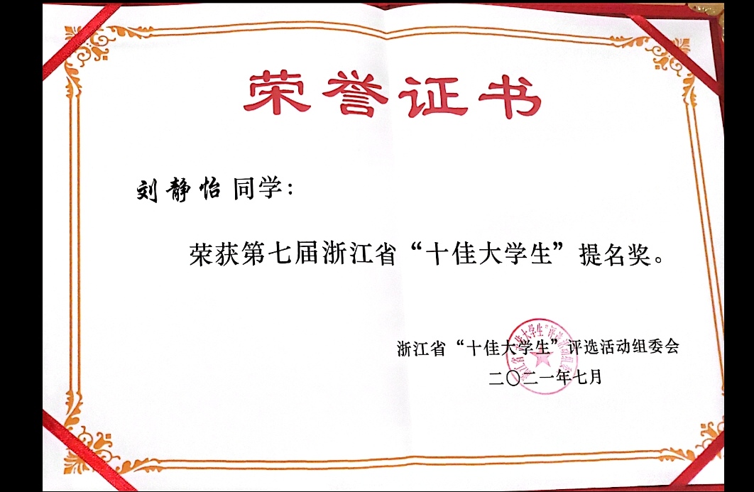 近日,第七届浙江省“十佳大学生”颁奖活动落下帷幕,我校bb贝博艾弗森官网2021届优秀毕业生刘静怡同学获浙江省“十佳大学生”提名奖。今年4月,省委宣传部、省教育厅、团省委、浙江广电集团联合开展省第七届“十佳大学生”评选活动,共有来自77所高校的候选人111位参与,最终30位同学成功入围评选活动,bb贝博刘静怡同学荣获提名奖。