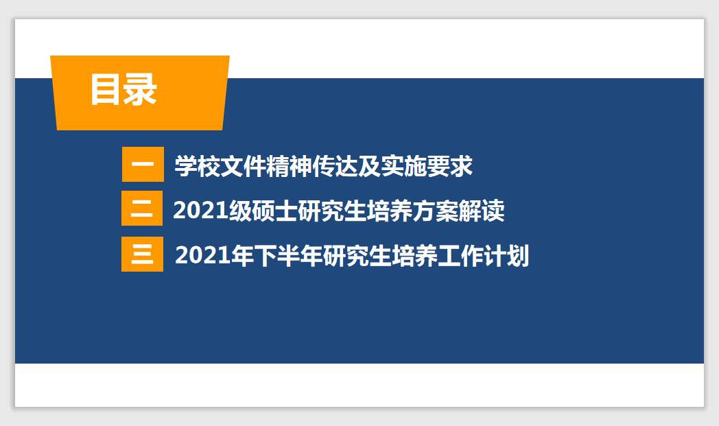 会上周云仙副院长首先转达学校相关文件精神传达,特别针对最新版《导师指导手册》中各项办法条例提出具体实施要求。其次就最新修订的2021级研究生培养方案作出解读,强调研究生培养环节中的注意点,包括研究生预开题、正式开题、预答辩、正式答辩等各环节以及公开发表学位论文等各项要求。最后对2021年下半年研究生培养计划进行说明,主要包括21级研究生制定培养计划、20级硕士研究生和同等学力研究生的预开题与正式开题、专硕临床实践考核等。