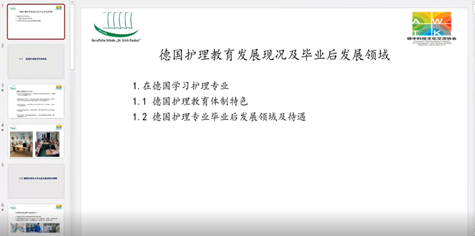 首先,李慧君主任介绍了德国宝隆博士bb贝博艾弗森官网项目的背景和意义,其次,陶兴煜会长介绍了德国护理教育体系及毕业后发展领域、丁涛秘书长介绍了德国宝隆博士bb贝博艾弗森官网项目的申请要求和流程;最后,德国宝隆博士bb贝博艾弗森官网项目的参与者、南京医科大学姚玉同学向大家分享了在德国学习和在医院实习的感受。在自由提问和互动环节,陶会长、丁秘书长、姚玉同学为线上的同学们答疑解惑。