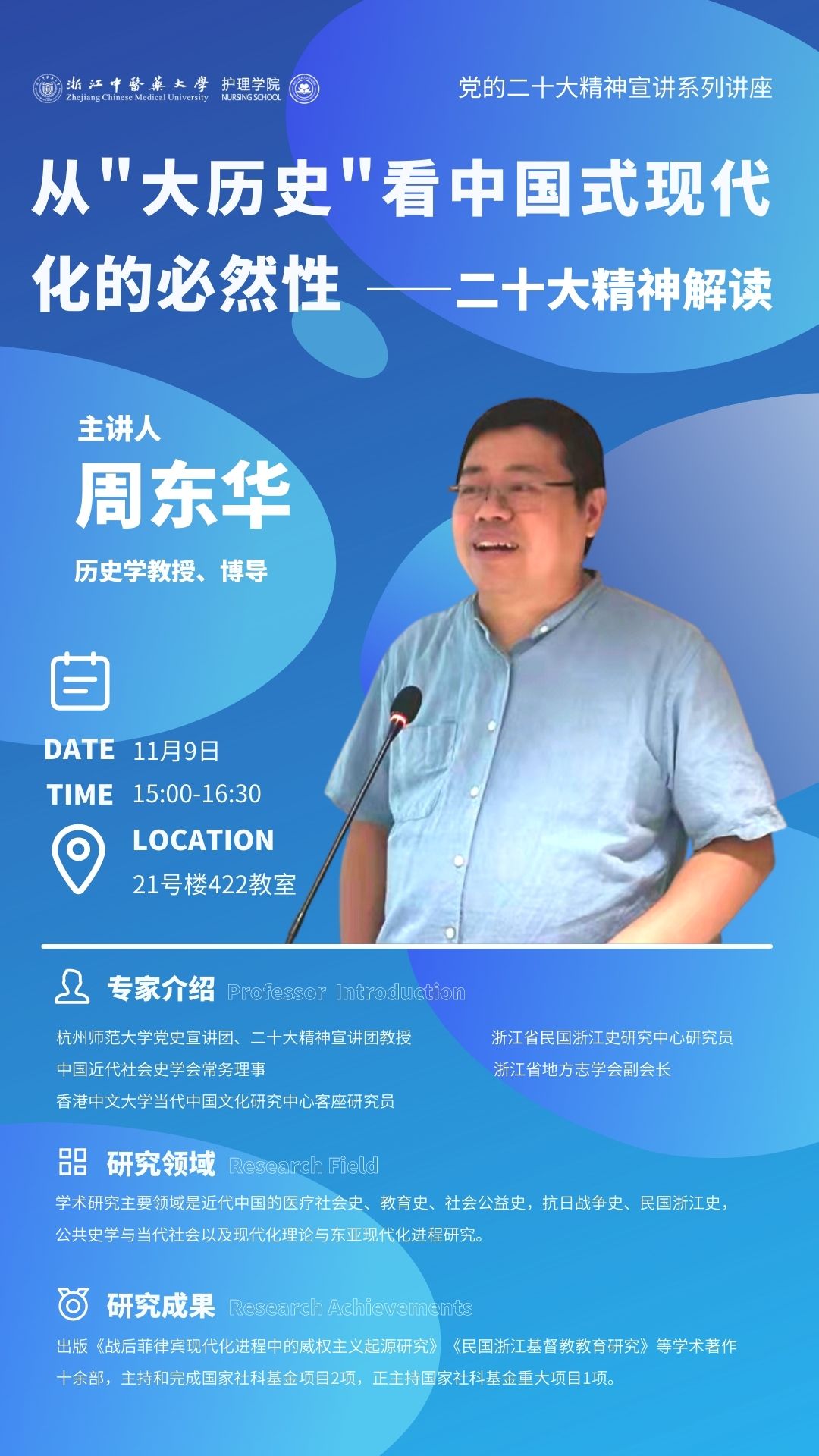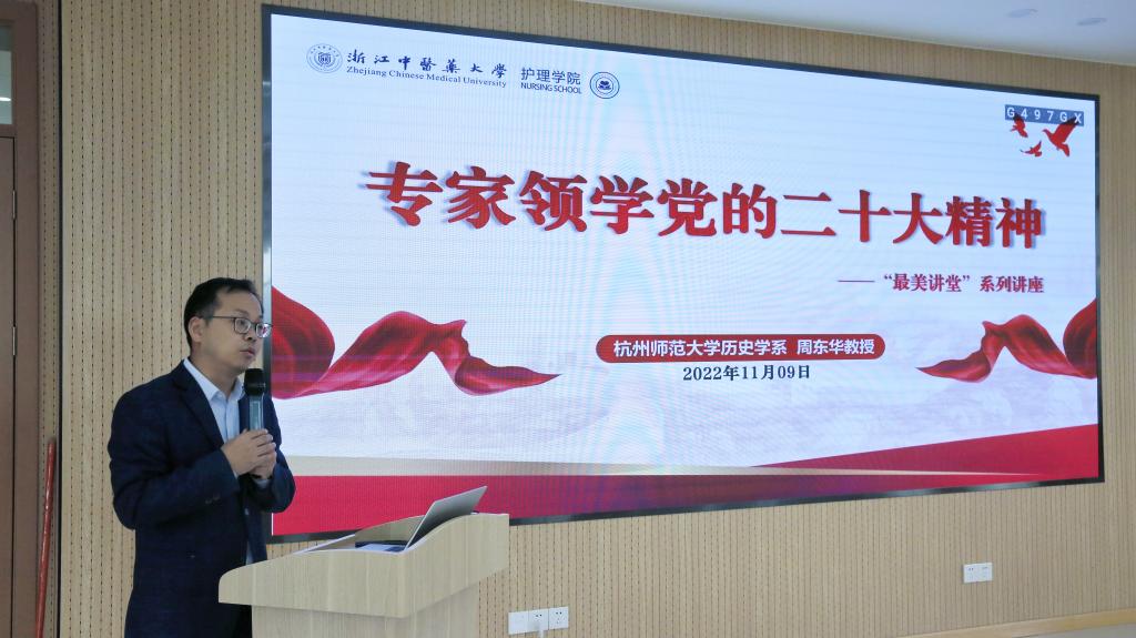 习近平总书记强调,要把学习宣传贯彻党的二十大精神这件大事抓紧抓好抓出成效。为认真学习好宣传好贯彻好党的二十大精神,牢牢把握会议精神中的核心要领,11月9日下午,bb贝博艾弗森官网组织开展“最美大讲堂”专家领学活动,特邀浙江省民国浙江史研究中心研究员,中国近代社会史学会常务理事,浙江省地方志学会副会长,杭州师范大学历史学系周东华教授作讲座。会议由bb贝博艾弗森官网党委书记李海滨主持,校计财处、国合处教师代表,bb贝博艾弗森官网全体教师和学生党员代表参加。