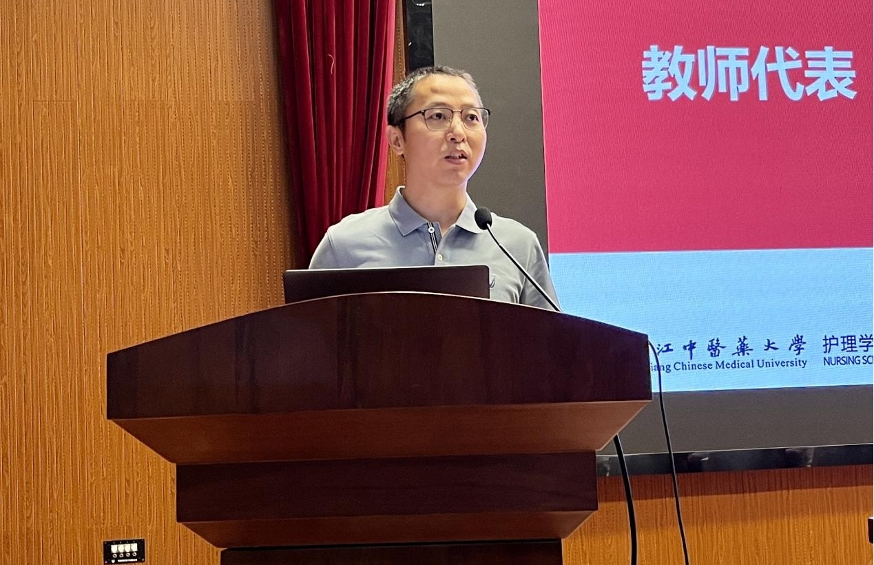 随后,护理人文教研室主任汪国建作为教师代表以诙谐幽默的语言发表讲话。他表示学院品牌——最美护理的美绝不仅限于外在,而是内化的美,从“求真、行善、寻美”等三阶段对新护生们寄予厚望。做一个求真的人,不做“假人”,明确自己的目标并坚定前行;行善,做“有用”的人,让自己成为太阳,为身处黑暗的人带来光亮;寻美,持续地追求和创造美好,并内化为对患者的温柔与关怀,对护理事业的热爱。