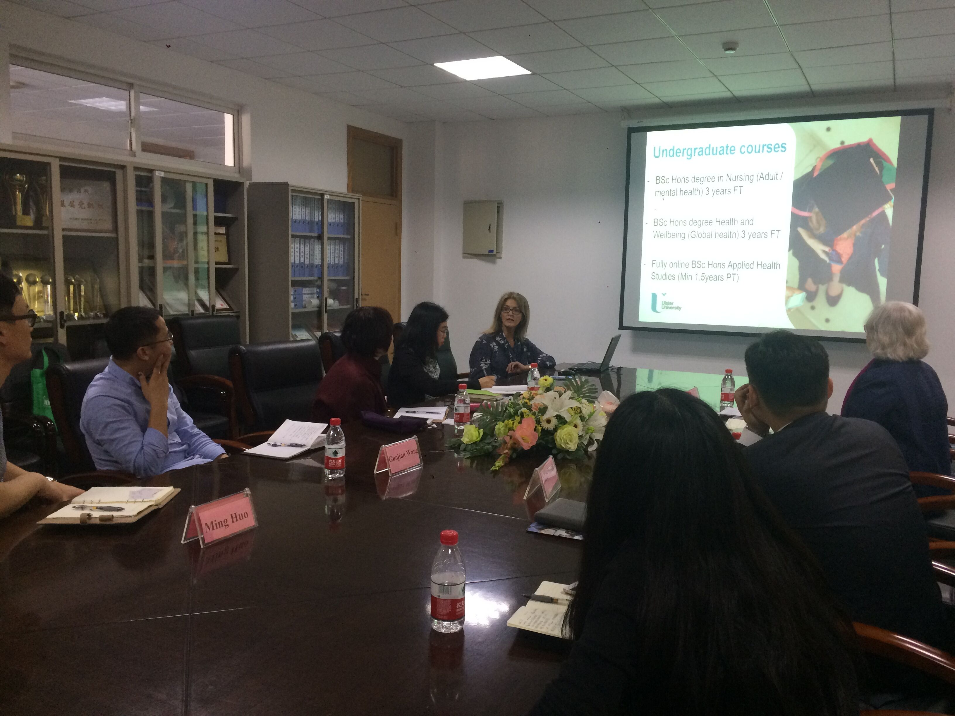 何桂娟院长向阿尔斯特大学的两位教授表示欢迎,并介绍了bb贝博艾弗森官网的历史沿革、护理和助产专业的学科建设、师资队伍和教学条件等。随后,阿尔斯特大学的Carol教授也介绍了该校的概况,包括地理环境、专业设置和学生就业等。Donnell教授详细介绍了该校护理专业的基本情况。阿尔斯特大学,地处北爱尔兰,其护理专业目前英国排名第5,具有本科、硕士、博士三个层次。地彼此了解后,双方就可能开展的合作进行讨论,关于本科生的“2+1+1”合作模式和研究生的“1+1+1”合作模式有开展的可行性达成共识。另外,关于开展学生短期交流项目、教师科研合作和师资培训等项目也做了深入沟通和交流,双方高度认可彼此的合作基层,愿意尝试各种新的项目,以促进彼此学科和文化的交流。