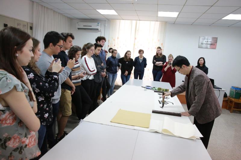 蒋剑锋副处长从中医学习、文化体验等方面总结了交流团的课程,肯定了这次国际交流将影响一个人的世界观、价值观,提倡学生们为促进中西方的文化交流做出努力。留学生分组对中西方环境、饮食、交通、交流方式等一系列文化差异做了展示和汇报。会间的双截棍、南拳、礼仪之邦等表演让比利时、捷克师生大开眼界,感受中国传统武术的魅力。方年根书记应邀展示了中国书法艺术,用书法的形式诠释了文化自信,为中国传统文化代言,现场书写了“精诚所至”和“大医精诚”两幅作品并赠送给比利时西弗兰德大学和捷克波西米亚大学。留学生们不愿错过实践的机会,纷纷拿起毛笔过了一把“书法瘾”,把涂鸦作品当宝贝带回国。