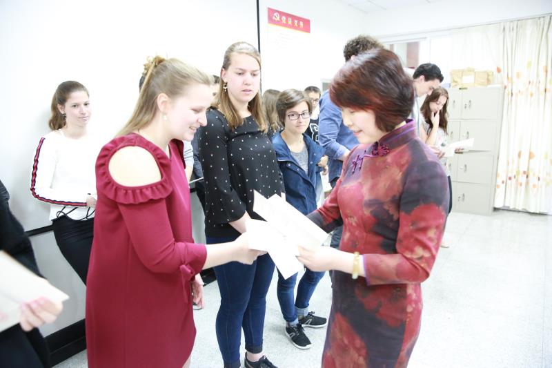 何桂娟院长身着旗袍,温婉高贵,代表bb贝博艾弗森官网对比利时-捷克学生们为期三周的交流团做了总结,欢迎她们多提意见,将来再回中国游玩和工作。