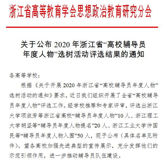 本次选树活动由浙江省教育厅、浙江省高等教育学会思想政治研究分会主办,是进一步贯彻全国全省教育大会、思想政治工作会议精神,全面落实立德树人根本任务,选树辅导员先进典型而开展的专项活动。活动共评选出“辅导员年度人物”10人、“辅导员年度人物提名”20人、“辅导员年度人物入围”50人。